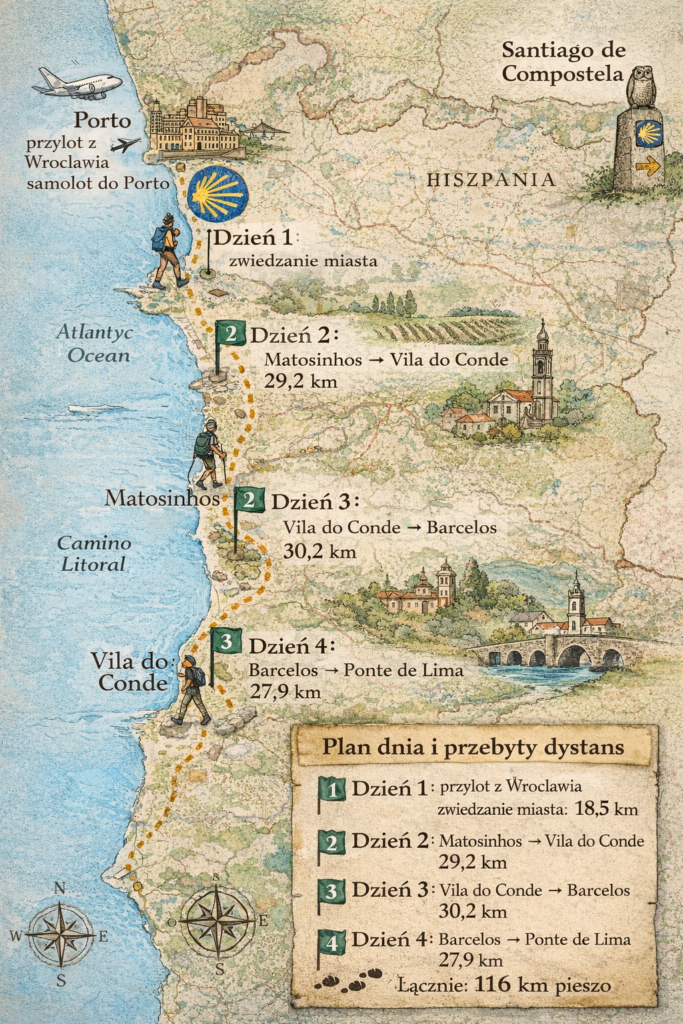 Łączny dystans pokonany pieszo w ciągu pięciu dni w Portugalii: 116 km.