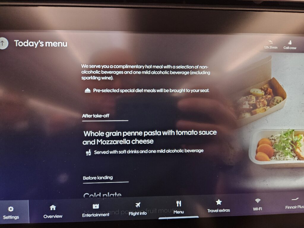 To, co bardzo spodobało mi się w Finnair, to rozpiska, o której godzinie można spodziewać się kolejnego posiłku, oraz możliwość zamawiania napojów z menu.
