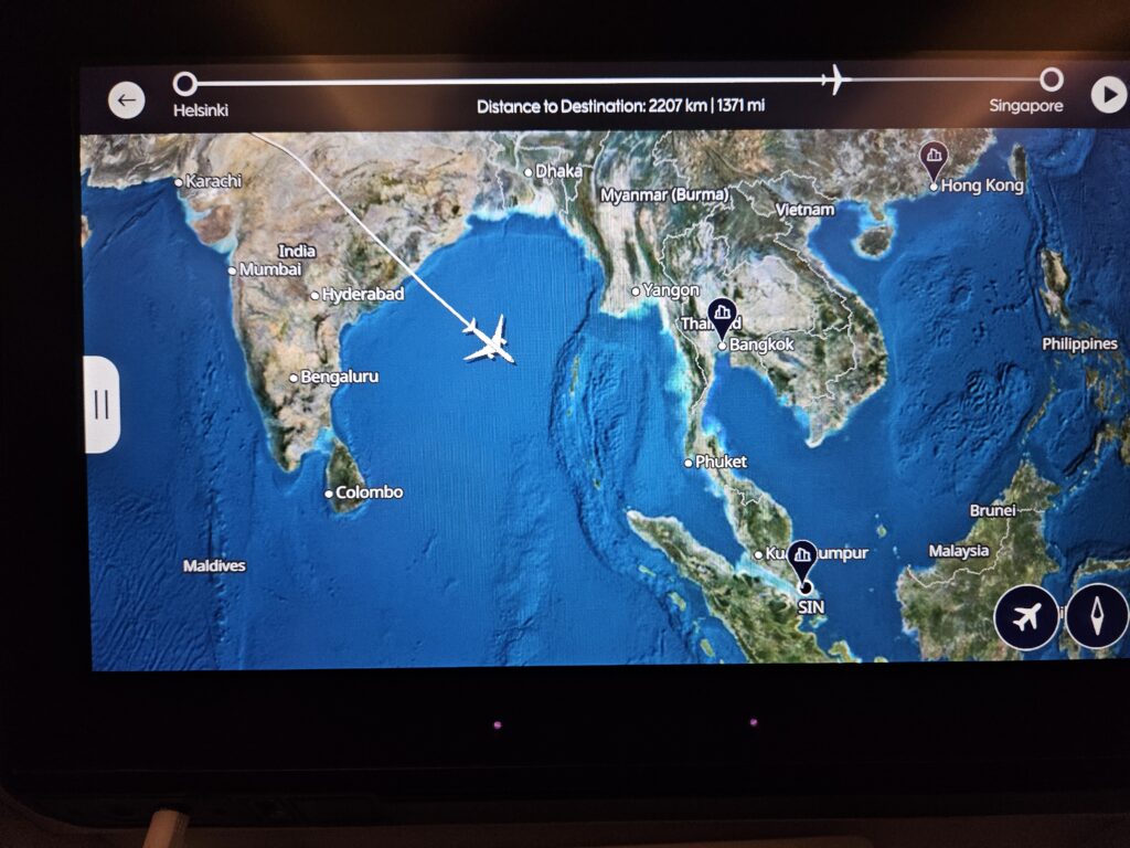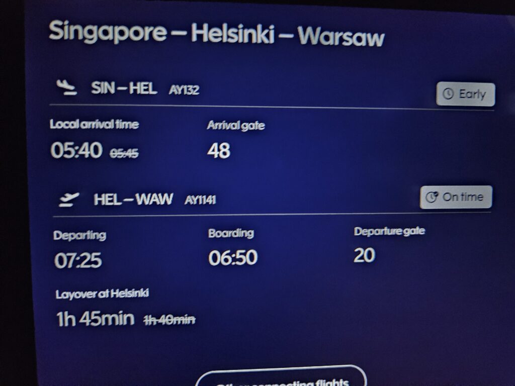 Czas podróży jest całkiem przyzwoity, choć obecnie nieco dłuższy niż kiedyś. Lot z Warszawy do Helsinek trwa około 1,5 godziny, natomiast z Helsinek do Singapuru około 12–13 godzin. W drodze powrotnej jest podobnie – odcinek Singapur–Helsinki zajmuje zazwyczaj 13–14 godzin, a Helsinki–Warszawa ponownie około 1,5 godziny. Różnice w czasie wynikają głównie z kierunku lotu i wiatrów na dużych wysokościach – lecąc na wschód, samolot często korzysta z prądów strumieniowych, natomiast w drodze powrotnej musi lecieć „pod wiatr”, co wydłuża czas podróży. Dodatkowo obecnie loty nie przebiegają nad Rosją, przez co trasa jest wydłużona i sam przelot do Azji jest dłuższy o około 2 godziny w porównaniu do tego, jak wyglądało to kiedyś.