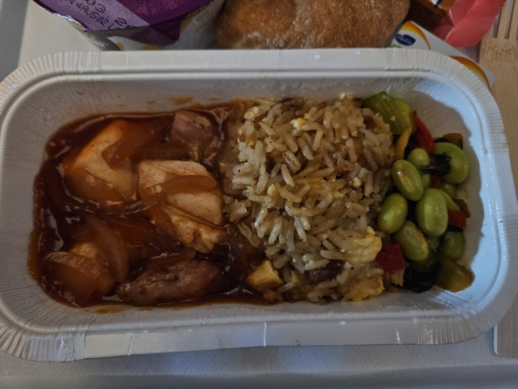 Na około dwie godziny przed lądowaniem światła zaczynają się rozjaśniać, a obsługa zaczyna roznosić śniadania. Była to jajecznica z bułeczką i masełkiem + batonik i mus owocowy.