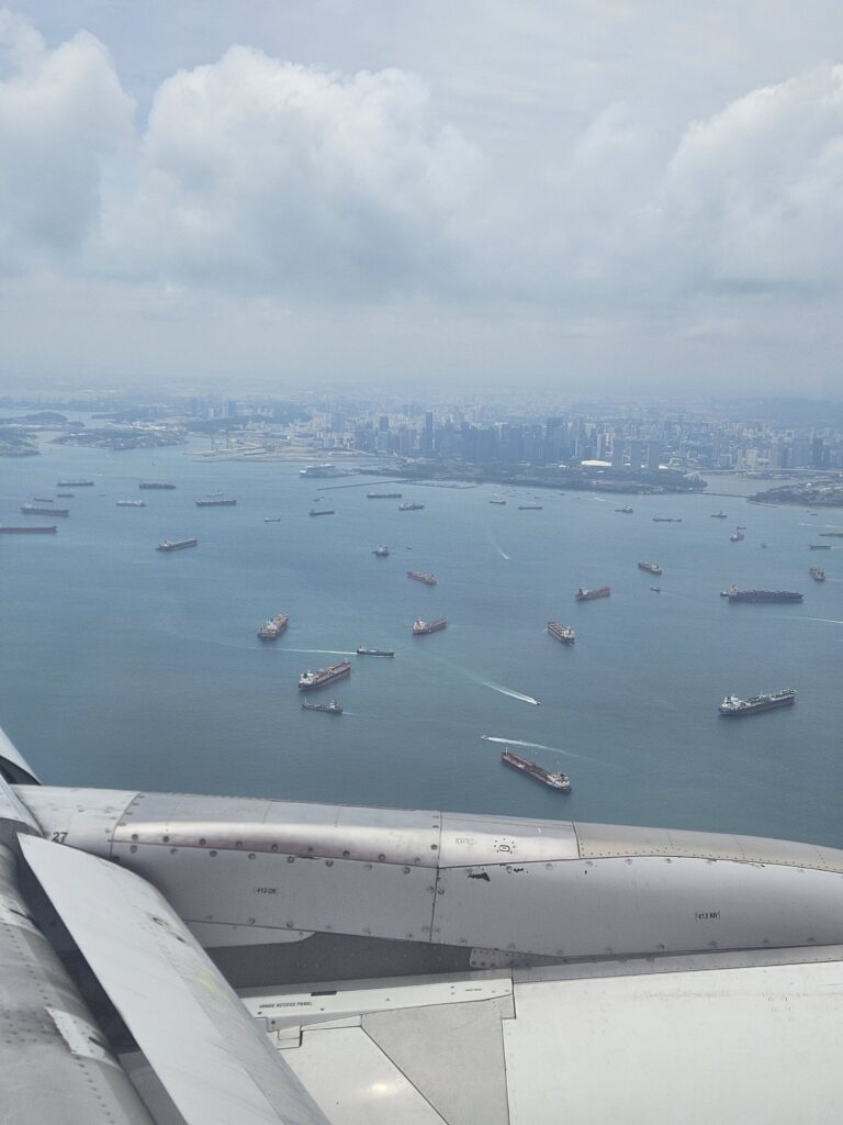 Przed samym lądowaniem pilot poinformował, że jest kolejka do lotniska i zrobimy kilka kółek. Tak też się stało – wyraźnie odczuwalne było krążenie nad zatoką singapurską. Trwało to około 15 minut.